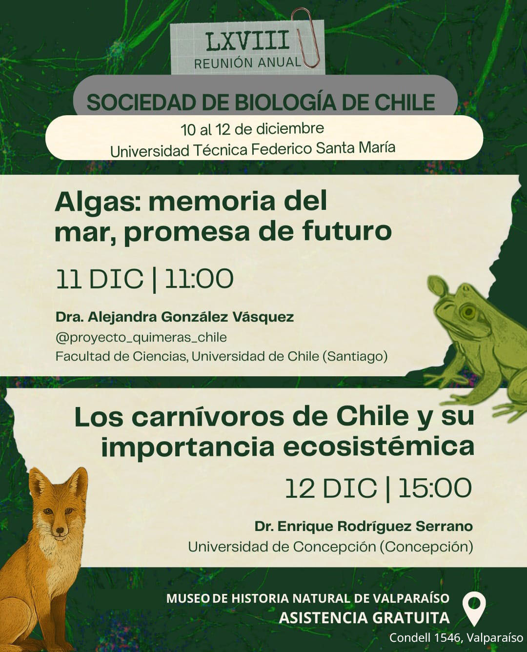 En el marco de la LXVIII Reunión Anual de la Sociedad de Biología de Chile, el Museo de Historia Natural de Valparaíso será escenario de dos destacadas charlas científicas abiertas a la comunidad, orientadas a la divulgación del conocimiento biológico y al fortalecimiento del vínculo entre la ciencia y la ciudadanía. Ambas conferencias se realizarán en el auditorio del museo con acceso gratuito.