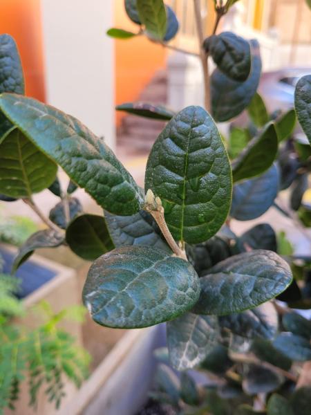 Puede alcanzar 25 metros de altura, hojas que pueden medir 11 cm aproximadamente, opuestas, pecioladas, oblongas con borde entero, duras y brillantes.