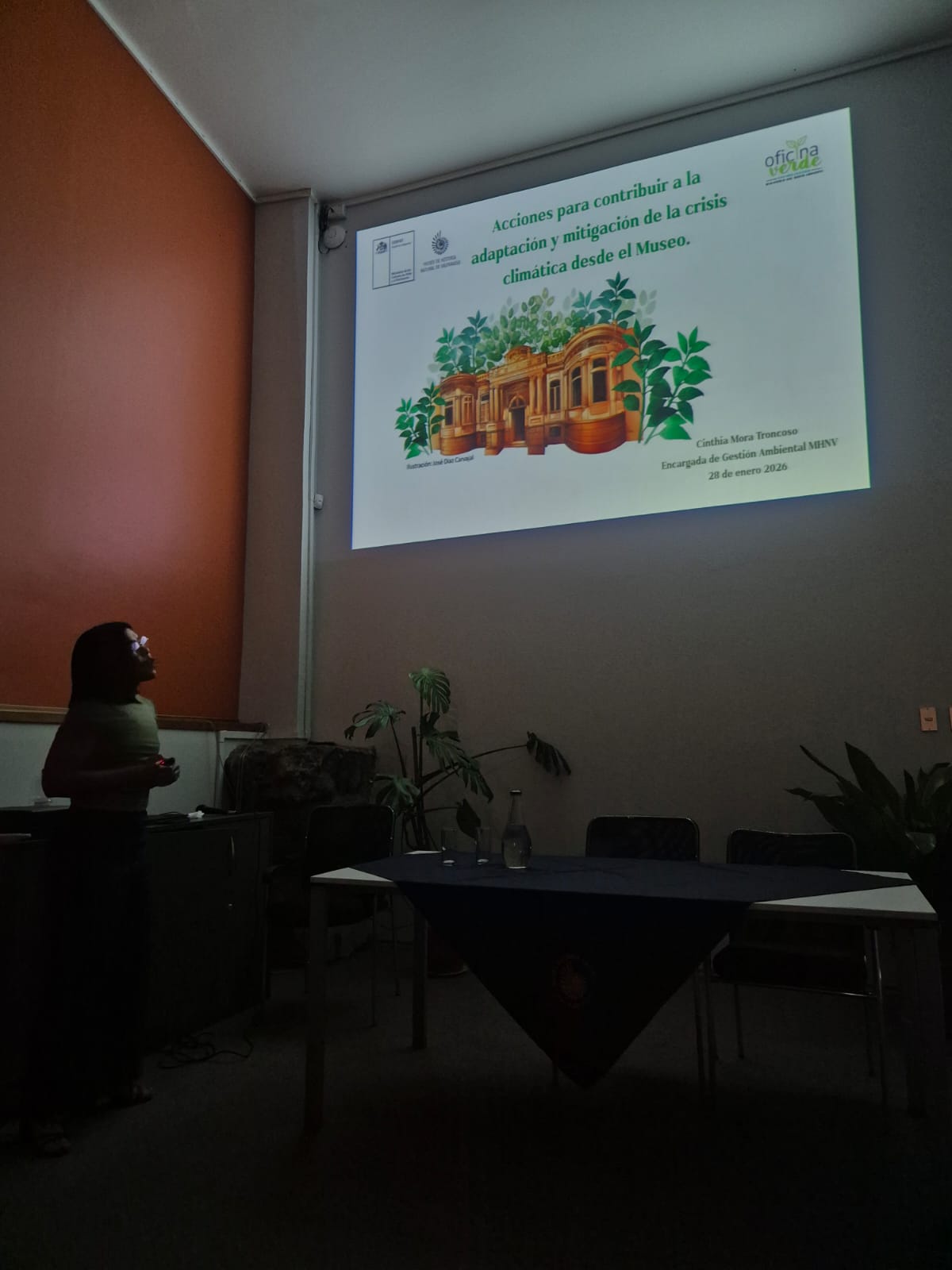 El cierre de la jornada estuvo a cargo de Cinthia Mora Troncoso, encargada de Gestión Ambiental del museo, Ingeniera Ambiental de la Universidad de Valparaíso, con postítulo en Prevención de Riesgos de la Universidad de Chile y diploma en Gestión Local y Cambio Climático de la Universidad de Concepción. Su presentación, titulada “Acciones para contribuir a la adaptación y mitigación de la crisis climática desde el Museo”, dio cuenta de las iniciativas desarrolladas por la institución en materia ambiental.