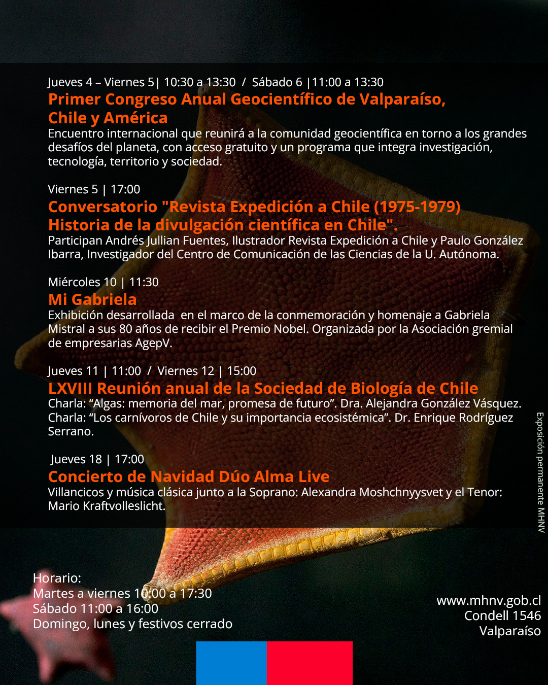 La programación incluye además la exhibición “Mi Gabriela”, en homenaje a Gabriela Mistral a 80 años de la obtención del Premio Nobel, así como dos jornadas de la LXVIII Reunión Anual de la Sociedad de Biología de Chile, con exposiciones centradas en el rol de las algas y la importancia ecosistémica de los carnívoros en los ecosistemas nacionales. El cierre musical estará a cargo del Concierto de Navidad del Dúo Alma Live, que ofrecerá un repertorio de villancicos y música clásica.