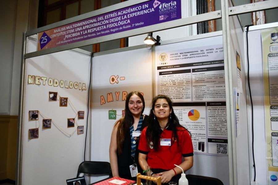 Por su parte, en la categoría de Enseñanza Media, el primer lugar fue para el proyecto “Análisis multidimensional del estrés académico en contextos STEM: una aproximación desde la experiencia percibida y la respuesta fisiológica”, del Liceo Bicentenario de Excelencia Polivalente San Nicolás, de la región de Ñuble. Bajo la guía de la docente Macarena Álvarez Franck y la participación de la estudiante Javiera Ortiz Oyarce, la investigación propone una metodología accesible y de bajo costo para medir el estrés académico a través de bioindicadores fisiológicos (alfa-amilasa salival) y su contraste con evaluaciones cualitativas, entregando evidencia valiosa sobre la salud emocional en contextos educativos de alta exigencia.