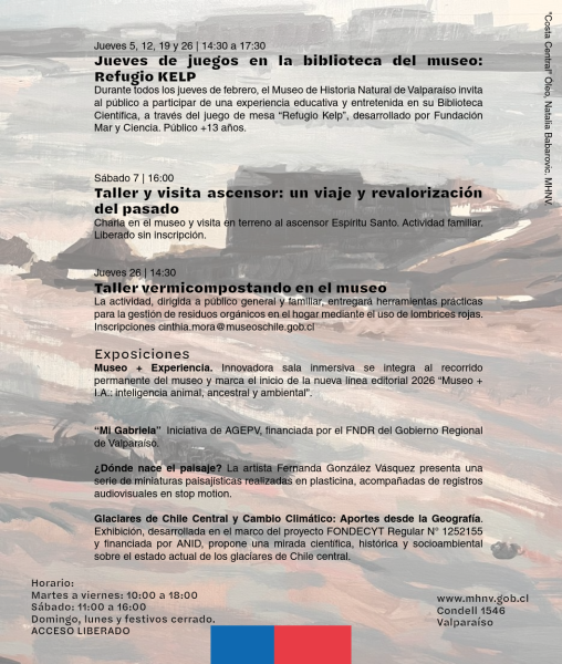 Durante el mes de febrero, el Museo de Historia Natural de Valparaíso invita a la comunidad a participar de una variada programación de actividades educativas, culturales y patrimoniales, pensadas para fomentar el aprendizaje, la creatividad y el vínculo con el territorio durante la temporada estival.