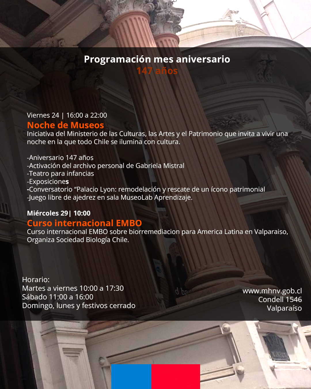 El viernes 24 de octubre, el museo se suma a la tradicional Noche de Museos, una iniciativa del Ministerio de las Culturas, las Artes y el Patrimonio. Desde las 16:00 hasta las 22:00 horas, el público podrá disfrutar de teatro para infancias, exposiciones, ajedrez libre en la sala MuseoLab Aprendizaje y el conversatorio Palacio Lyon: remodelación y rescate de un ícono patrimonial. Asimismo, se activará el archivo personal de Gabriela Mistral, en una velada que celebrará el aniversario número 147 en conexión con todo el país.