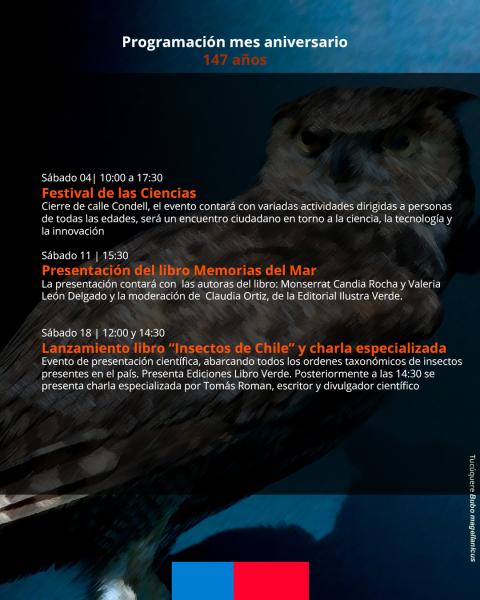 El Museo de Historia Natural de Valparaíso cumple 147 años de vida institucional y lo conmemora durante octubre con un nutrido programa de actividades que reflejan su misión de difundir el conocimiento científico, promover la cultura y fortalecer el compromiso con las buenas prácticas ambientales.
