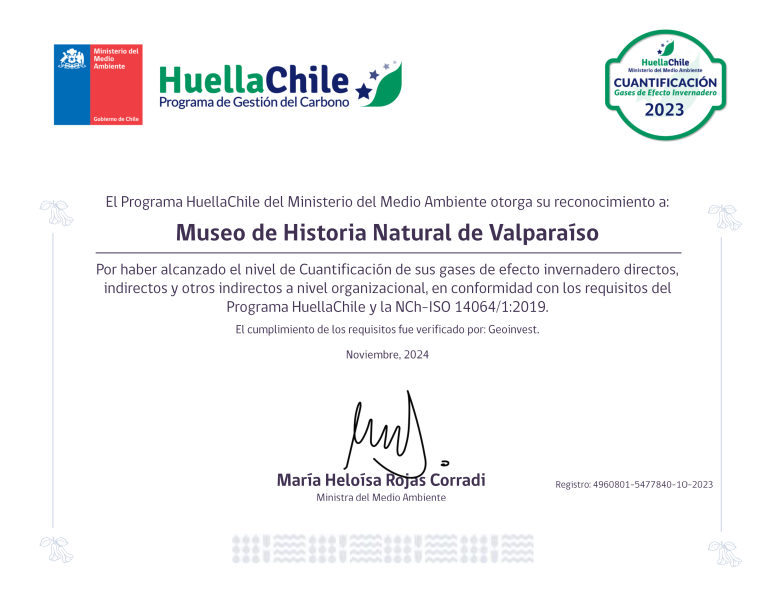 El Museo de Historia Natural de Valparaíso ha marcado un hito histórico al convertirse en el primer museo del Estado de Chile y del Servicio Nacional del Patrimonio Cultural en recibir la certificación del programa HuellaChile por la cuantificación de sus emisiones de gases de efecto invernadero (GEI). Este reconocimiento, otorgado por el Ministerio del Medio Ambiente, reafirma el compromiso del museo con las buenas prácticas ambientales y se suma al desafío de postular en marzo de 2025 al nivel de excelencia de la acreditación Oficina Verde.