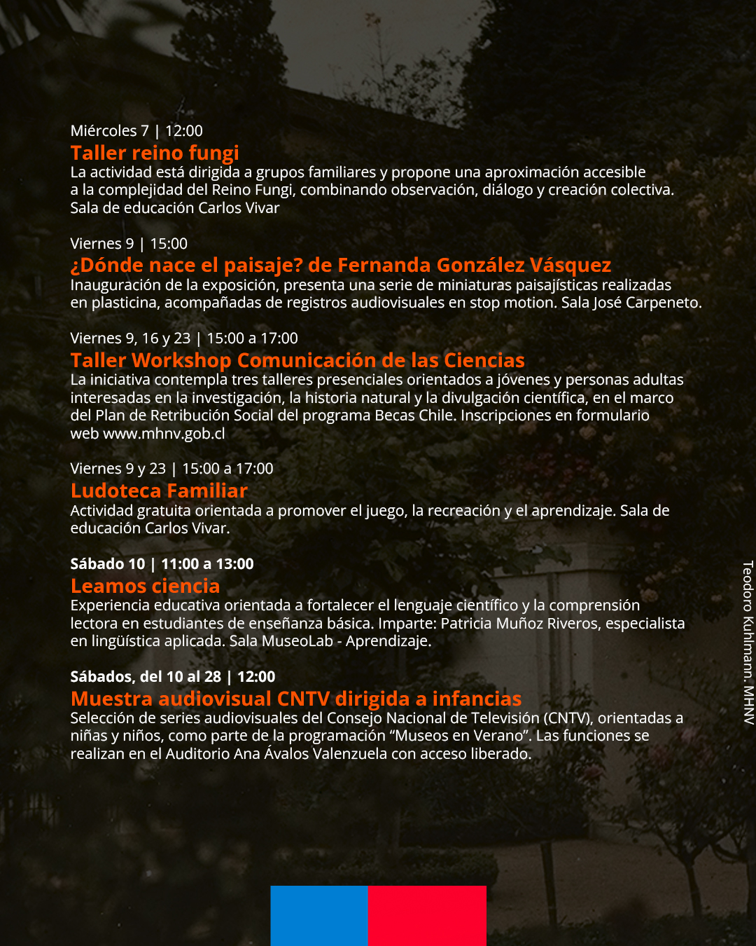 El viernes 9, la cartelera se diversifica con la inauguración de la exposición ¿Dónde nace el paisaje?, de la artista Fernanda González Vásquez, en la Sala José Carpeneto. La muestra presenta una delicada serie de miniaturas paisajísticas realizadas en plasticina, acompañadas de registros audiovisuales en técnica stop motion, invitando a reflexionar sobre la construcción del paisaje desde una mirada artística y sensible. Ese mismo día se da inicio al Workshop de Comunicación de las Ciencias, ciclo de tres talleres presenciales que se desarrollará también los días 16 y 23 de enero, orientado a jóvenes y personas adultas interesadas en la investigación, la historia natural y la divulgación científica, en el marco del Plan de Retribución Social del programa Becas Chile.