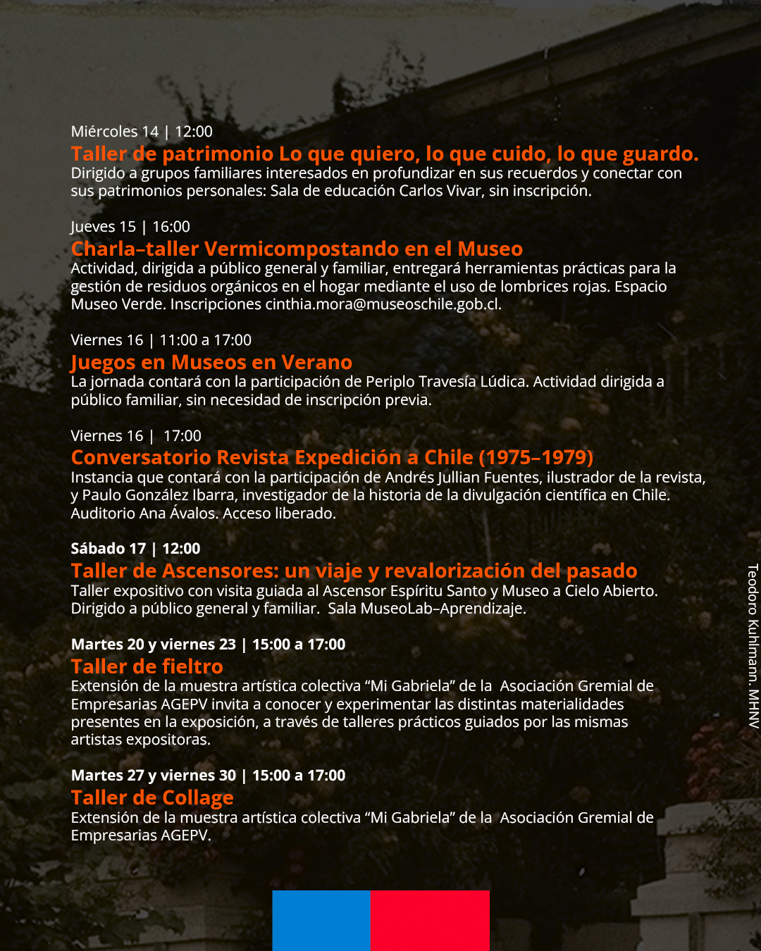 El enfoque patrimonial estará presente el miércoles 14, con el taller Lo que quiero, lo que cuido, lo que guardo, orientado a grupos familiares interesados en reflexionar sobre sus memorias y patrimonios personales, y el sábado 17, con el Taller de Ascensores: un viaje y revalorización del pasado, que contempla un recorrido guiado por el Ascensor Espíritu Santo y el Museo a Cielo Abierto, poniendo en valor estos íconos del patrimonio urbano de Valparaíso.