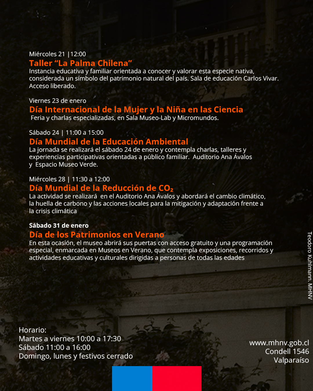 La programación culmina el sábado 31 de enero, con la celebración del Día de los Patrimonios en Verano, jornada en la que el museo abrirá sus puertas con acceso gratuito y una programación especial que contempla exposiciones, recorridos y actividades educativas y culturales para personas de todas las edades.