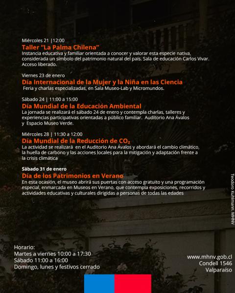 La agenda de enero incluye además talleres artísticos vinculados a la muestra Mi Gabriela, los días 20 y 23, el Taller La Palma Chilena, el miércoles 21, orientado a valorar esta especie emblemática del patrimonio natural, y la conmemoración del Día Internacional de la Mujer y la Niña en la Ciencia, el viernes 23, con una feria y charlas especializadas en los espacios MuseoLab y Micromundos.