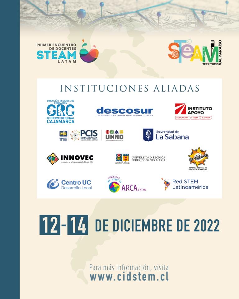 El Primer Encuentro de Docentes STEAM-Latam se desarrollará en Valparaíso desde el 12 al 14 de diciembre 2022, con la participación de docentes, estudiantes de pedagogía, investigadoras, investigadores y diferentes personas vinculadas a educación STEAM interesadas en continuar entretejiendo una red de comunidades profesionales de docentes, que posibilite avanzar en la integración de estos distintos saberes en la educación de niñas, niños y jóvenes, y que, en convivencia con los saberes locales y en reconocimiento de nuestra identidad latinoamericana, permitan responder a los diferentes desafíos regionales y globales que enfrentamos como sociedad.